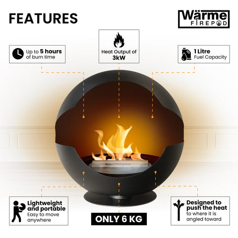 The Wärme FirePod is a stylish bio ethanol fireplace freestanding design that brings real flame ambience to any space without the need for a chimney or installation. Powered by clean-burning bioethanol fuel, this elegant bioethanol fuel fire creates a beautiful, natural flame without smoke, soot, or ash. Its portable, freestanding design makes it perfect for living rooms, dining areas, conservatories, or even sheltered outdoor spaces, giving you complete flexibility to position your fire exactly where you want it.